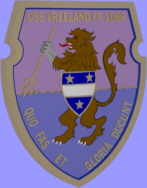 | The heraldic ramifications of the Vreelands crest are many. The central design is that of the (VON) Vreeland family originally from Amsterdam, Holland. The blazon of the shield which is approriate for the ship and its mission is that of a blue shield representing the oceans, the fess (horizontal bar) that of a convoy, while the three mullets (stars) allude the three major missionsof the ship; submarine hunter-killer, convoy escort and surveillance. The stars themselves symbolic of achievement, leadership and wisdom, while the number three in numerology denotes action, power and inspiration. The rampart lion supporting the coat of armsis a heraldic symbol of bravery and forthrightness, and its stalking pose one of deliberate intent. Its mailed fist illustrates the Vreeland's unremitting, iron thrust at the enemy below, while the claspedtrident is indicative of nautical supremacy. The centerwork is set against a sea blue field, the natural unfettered element of Vreeland.Contained within is the motto, "QUO FAS ET GLORIA DUCUNT": "WHERE DUTY AND GLORY LEAD". |